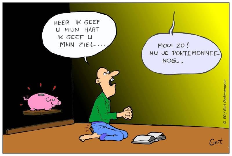 Niks mis met deze cartoon Alleen met degenen die het verkeerd opvatten of interpreteren Hiermee wordt gewoon bedoeld dat je je financiën ook in God's handen mag leggen, dat je jezelf zeker dus niet tekort hoeft te doen maar ook je geld ten dienste mag …