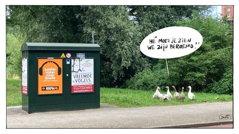 Zo mooi een poster met vreemde vogels, en een groep kwakende vogels ernaast ...