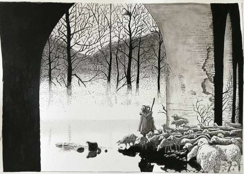 Tekening van herder, kudde en een rivier onder een brug.