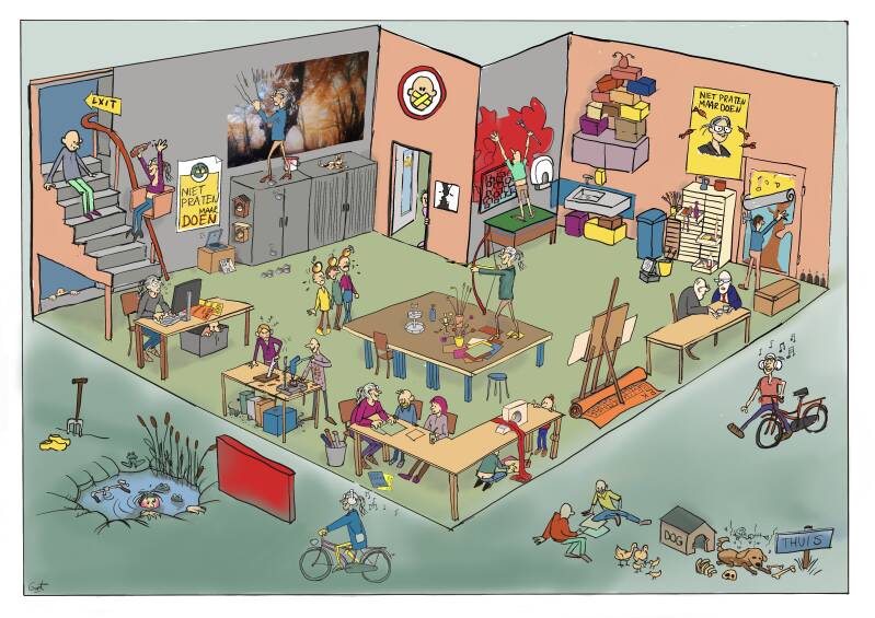 Tekening voor afscheid van Gerda. Veel van de ingrediënten van de tekening zijn op gebeurtenissen gebaseerd.