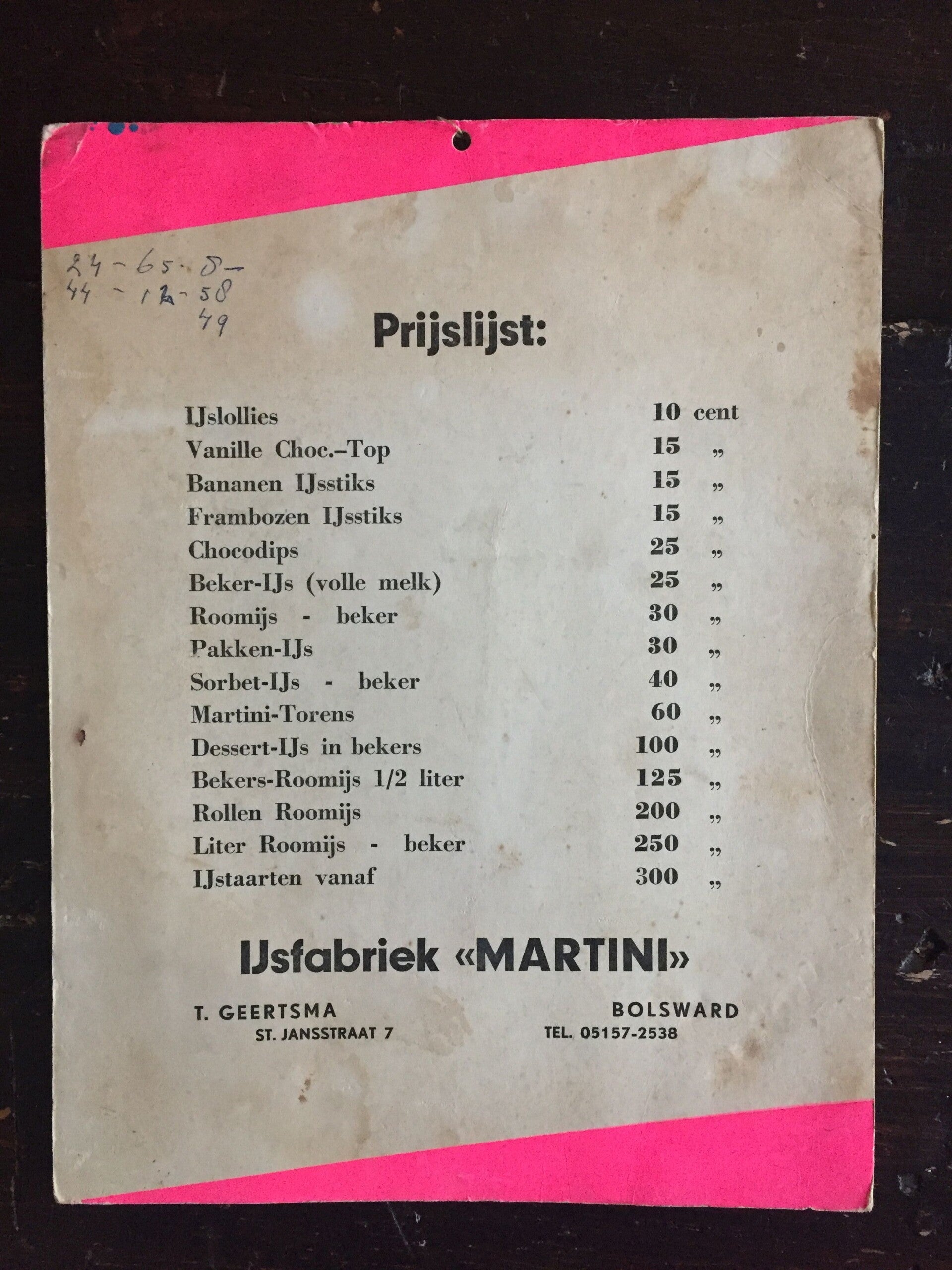 Banketbakkerij Geertsma, gevestigd aan de Sint Jansstraat 7 in Bolsward, was in de jaren '60 bekend om het produceren van Martini-ijs. Dit ijs werd verkocht vanuit ijscowagens, zoals die van Klaas Koopmans. Bijzonder was dat sommige ijsjes een stokje hadden met de opdruk "Martini-ijs". Gelukkige vinders van zo'n stokje konden deze inleveren voor een gratis ijsje. (Dit is de keurige logischer verwoording van bovenstaand, met verwijzing naar mijn site).