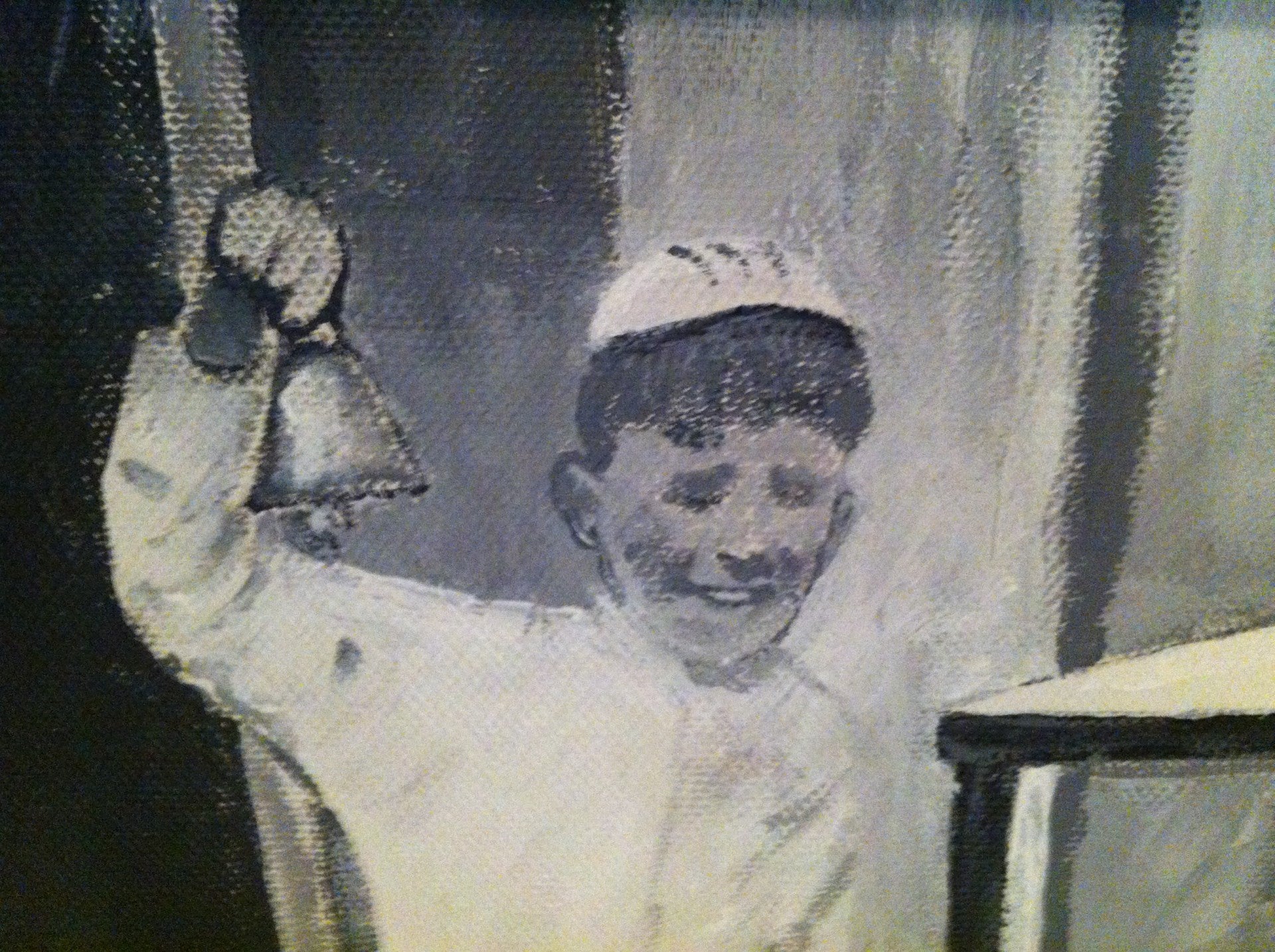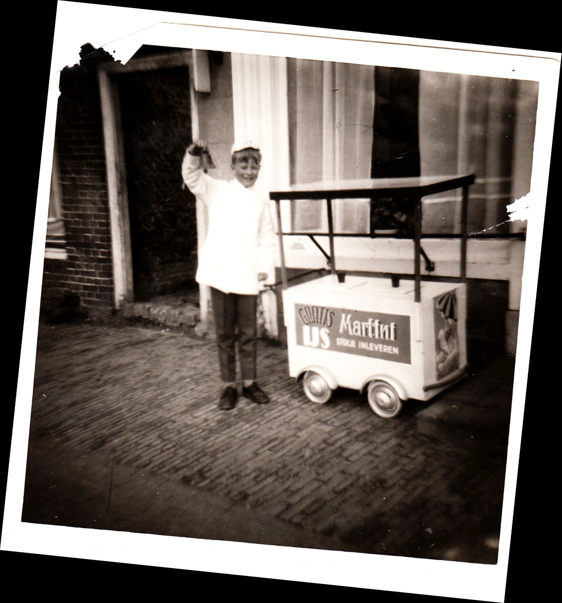Rienk als ijsverkoper met bel bij een ijs-wagen van zijn vader.