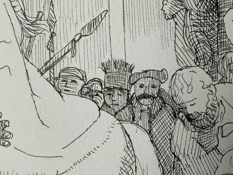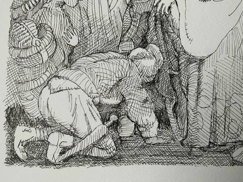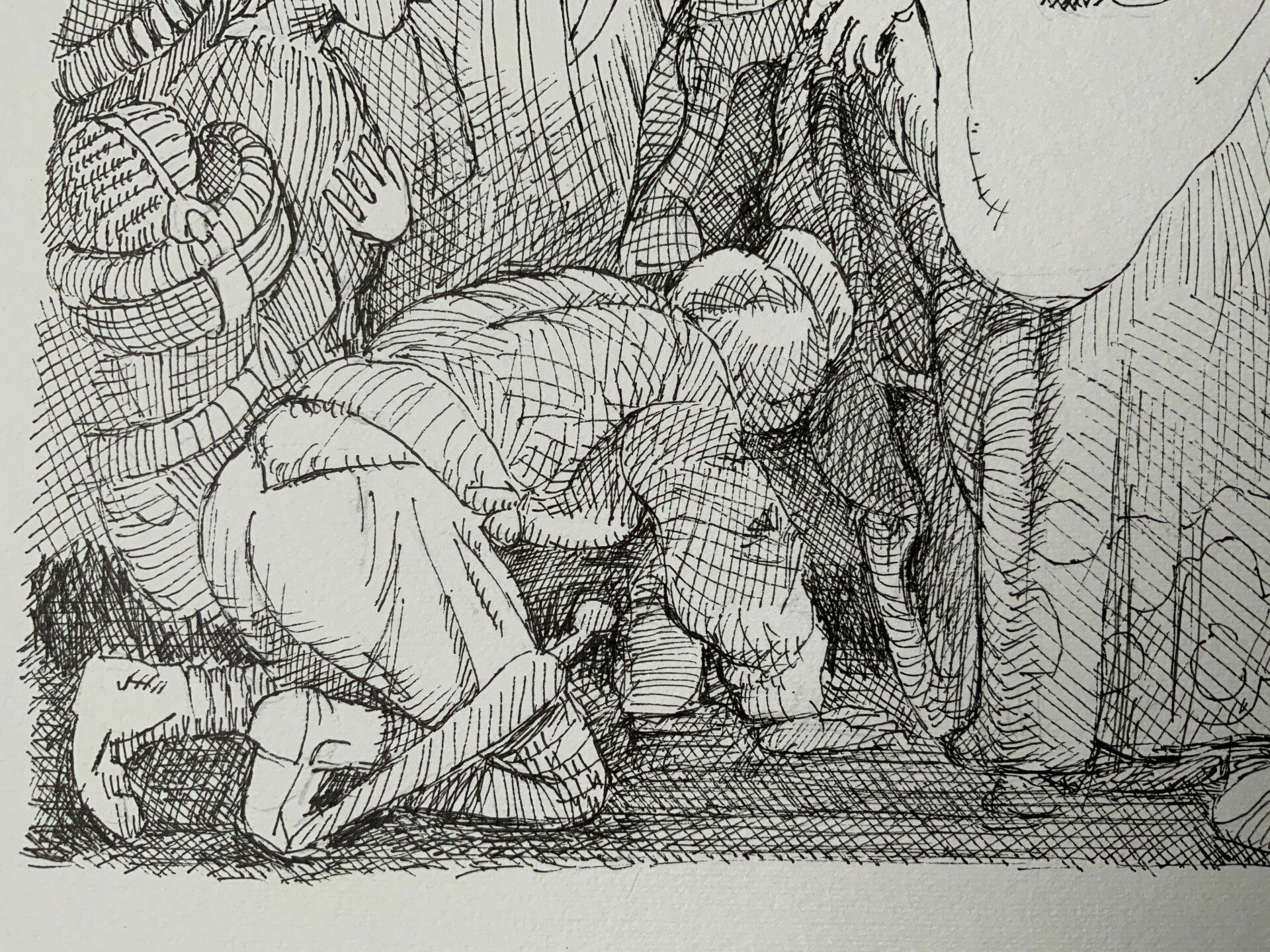Mijn uitvoering is opnieuw een anachronisme. Ik heb met uitgevoerd op papier 50 x 70 cm groot, na het schetsen met potlood heb ik een watervaste pen gebruikt met dikte 0,3 mm.
