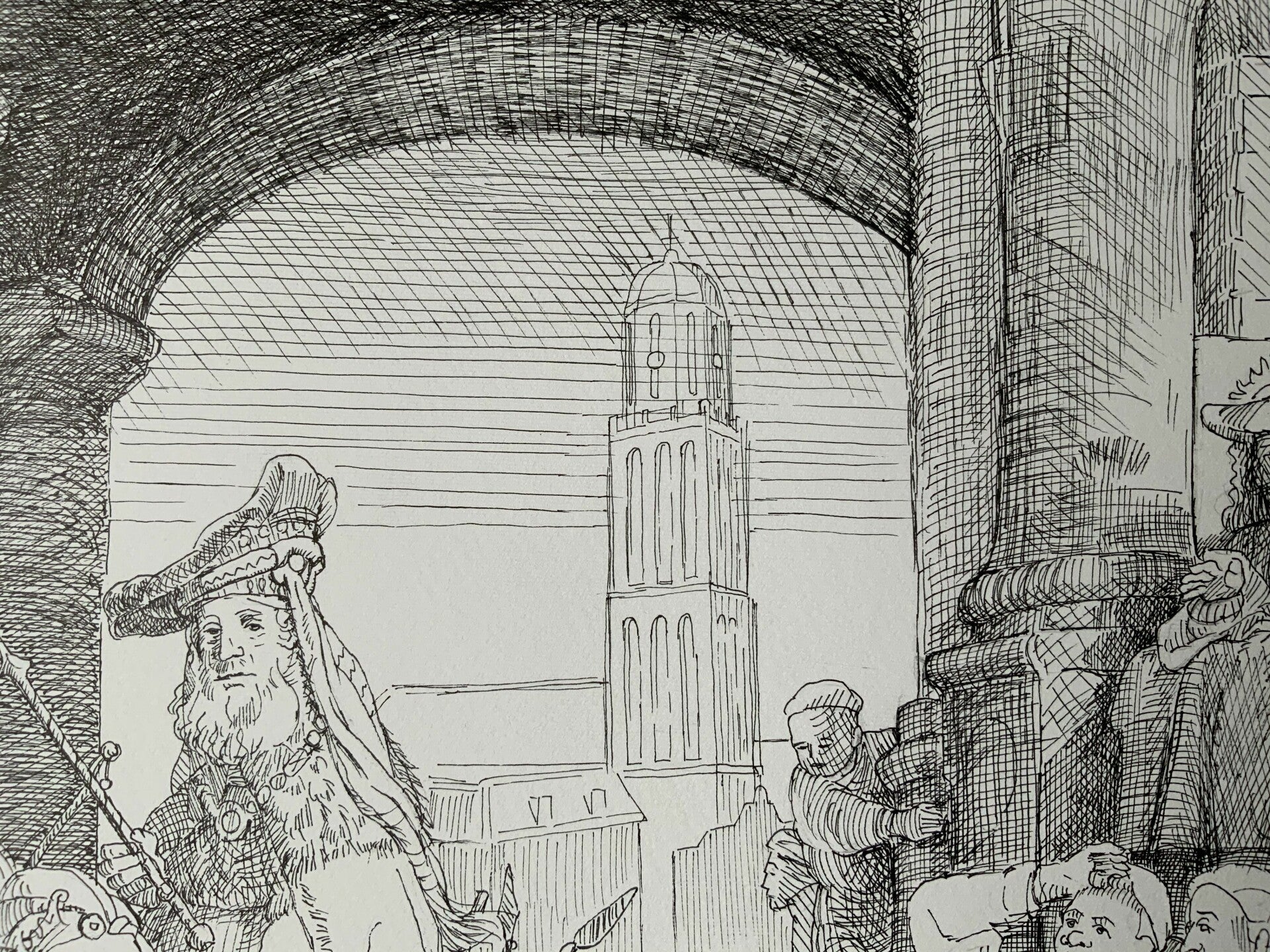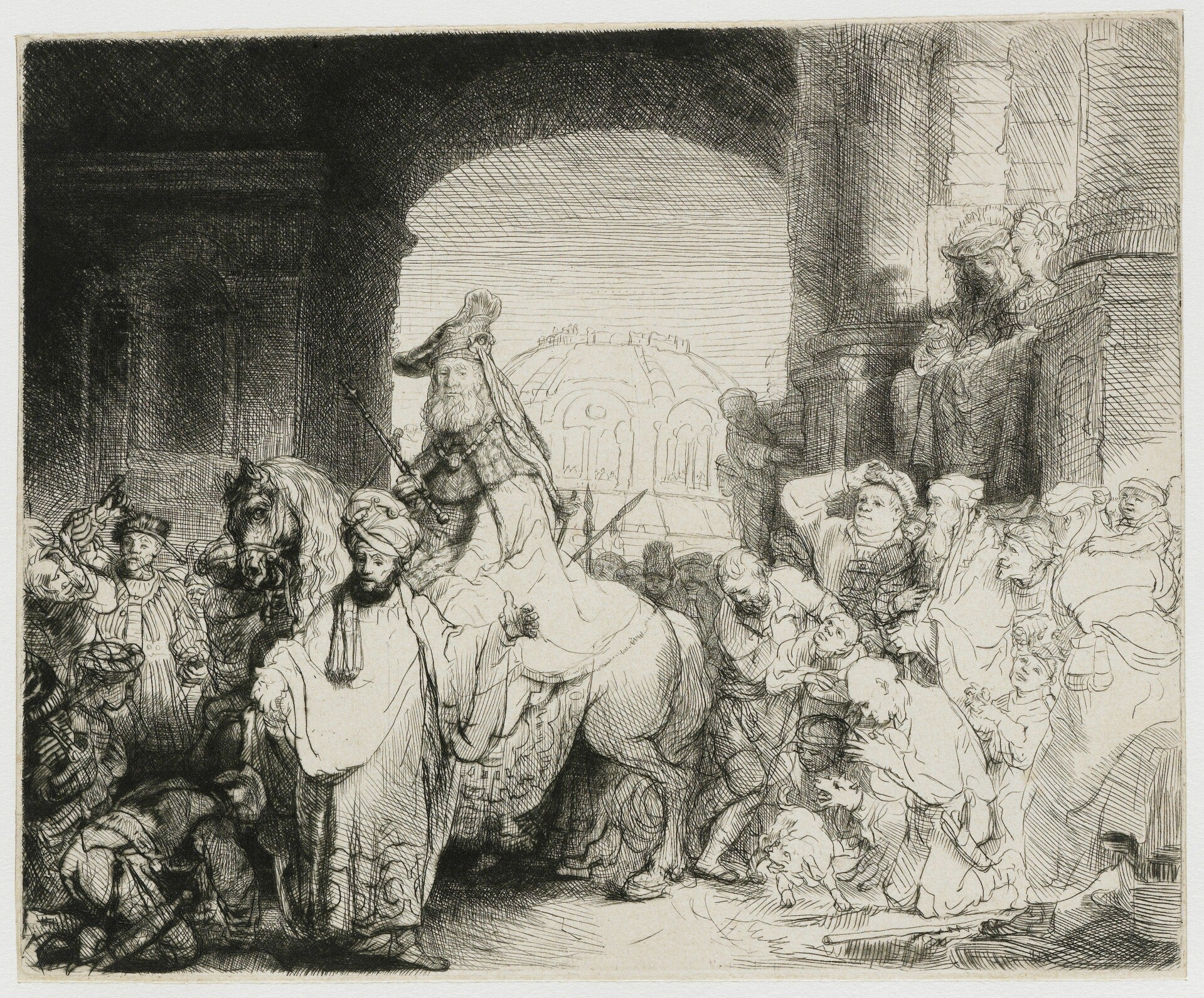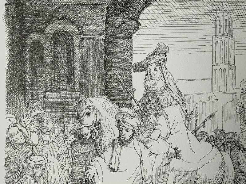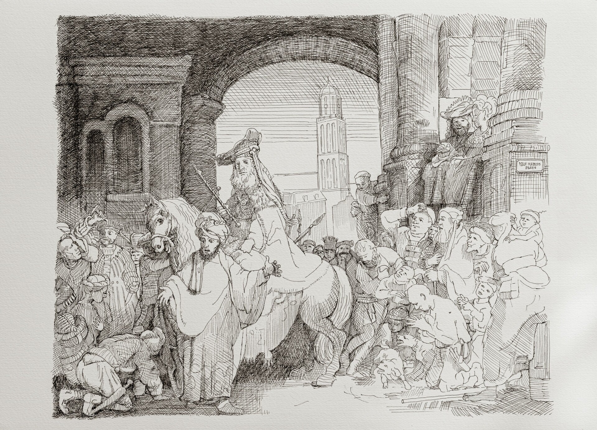 Vrije bewerking van een ets van Rembrandt ‘de triomf van Mordechai’.