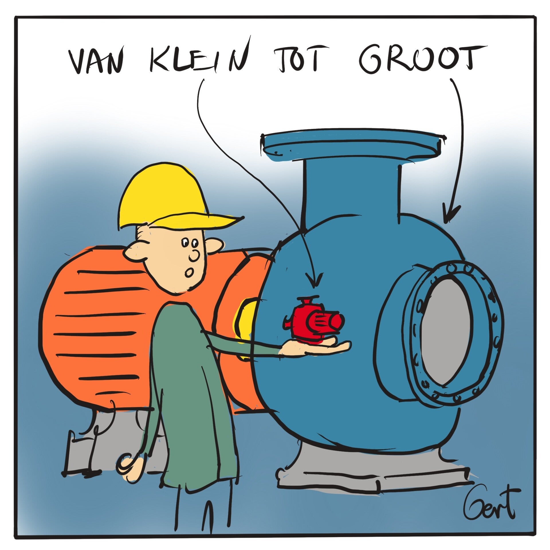 Tekeningen uit de periode dat ik werkzaam was bij HBM / HBG Materieelservice, later BAM Materieel genoemd en opvolgend Vanderkamp Pompen. Voor allerlei doeleinden: toolboxen, lezingen, voor  collega's, en soms gewoon mijn (overtrokken) reactie op wat er gebeurde. Niet alles berust op werkelijke gebeurtenissen. Soms gaat het ook gewoon over 'werk', of 'werkomstandigheden'. Klik op afbeelding om deze vergroot te zien.